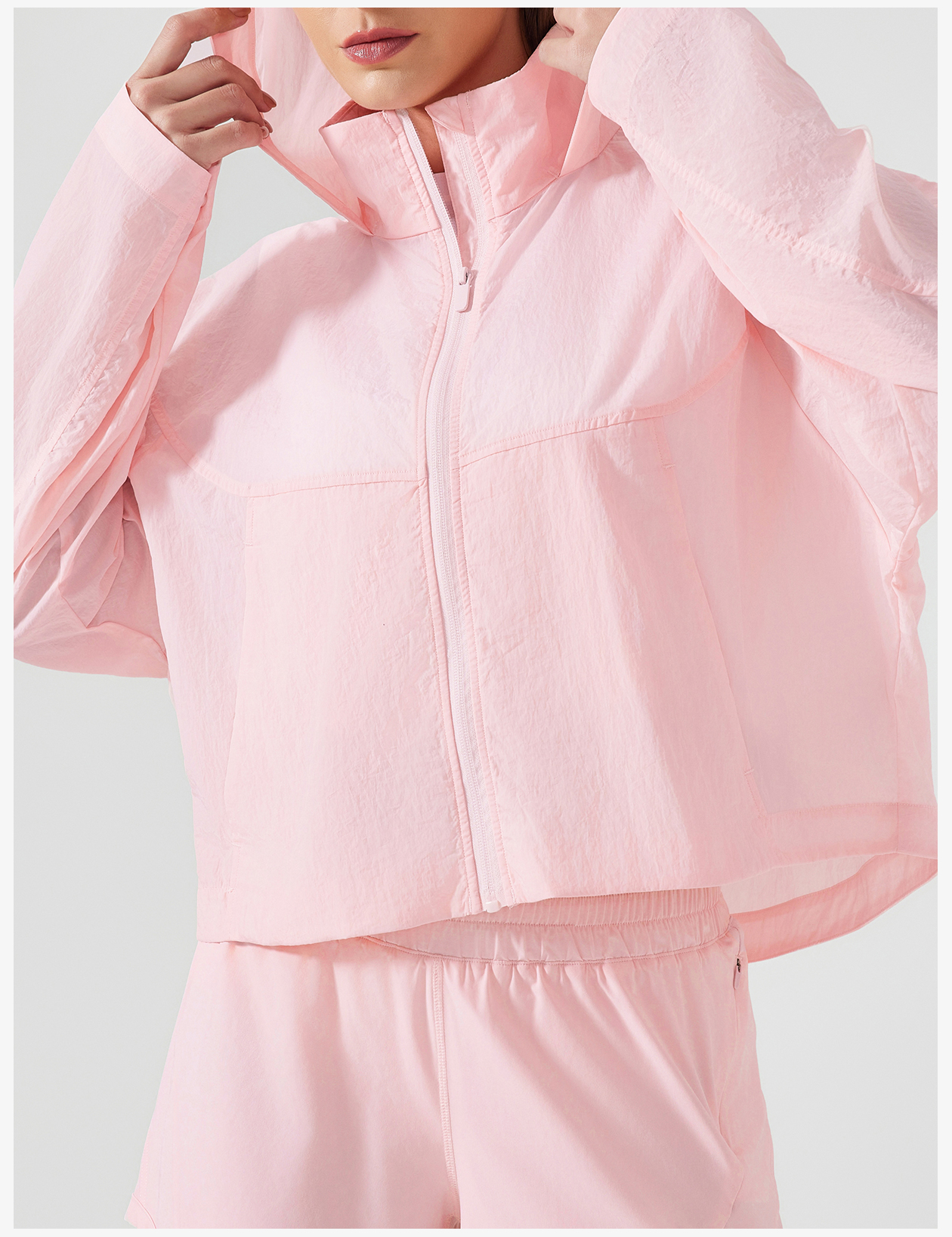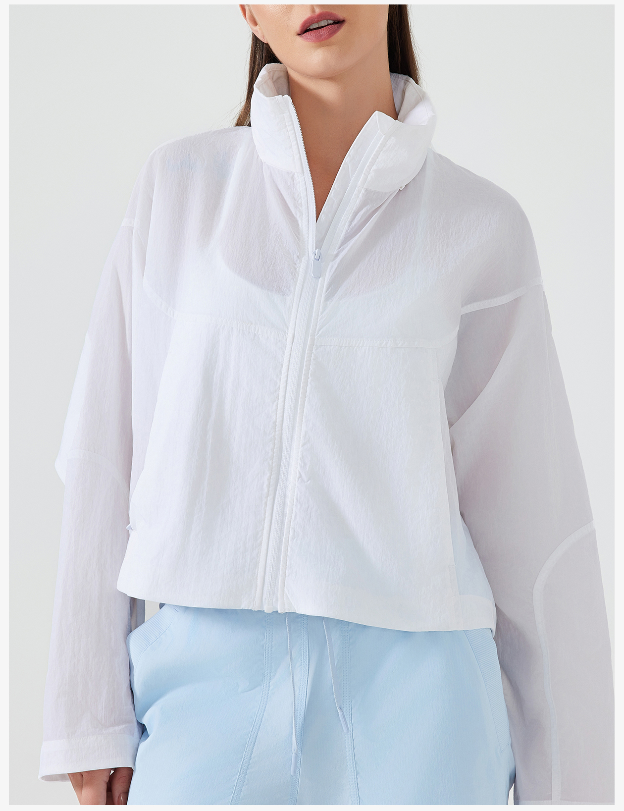 Women's Light Blue Cropped Windbreaker Jacket - Loose Fit, Sporty Style
