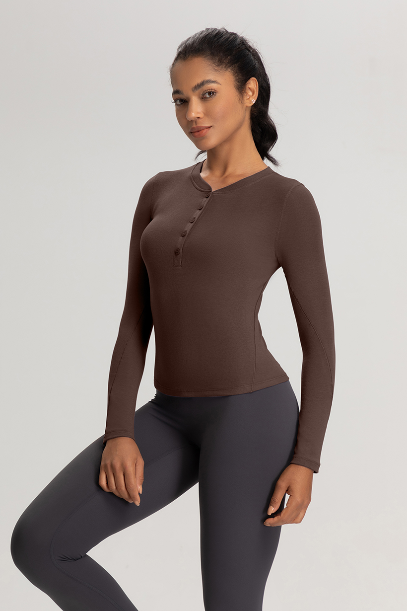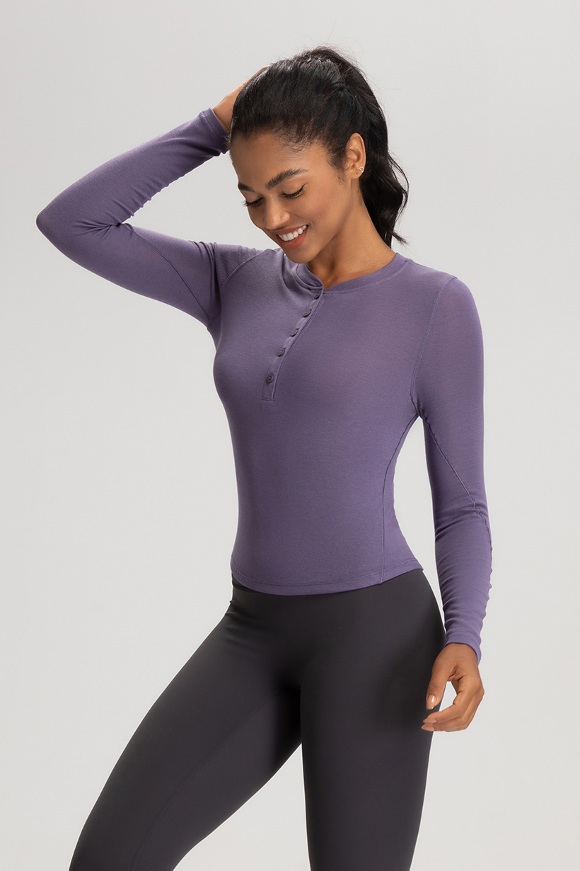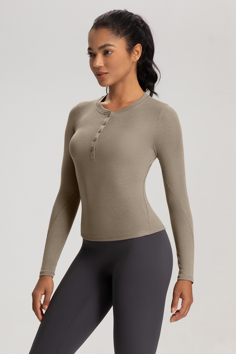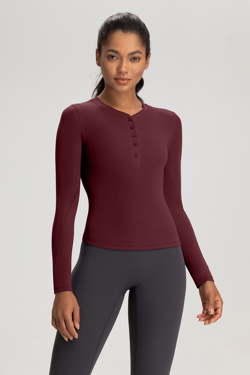 Women's Long - Sleeve Henley Neck Yoga Top, Slim Fit Athletic Workout Shirt