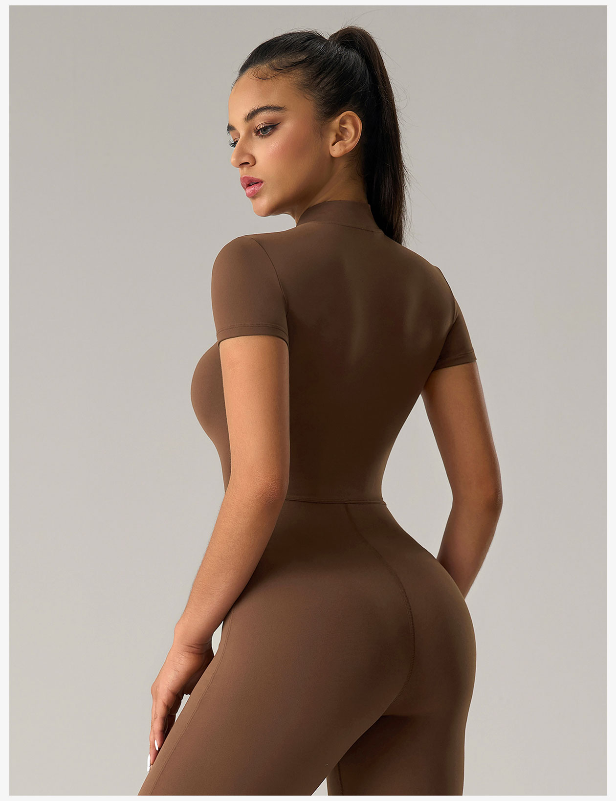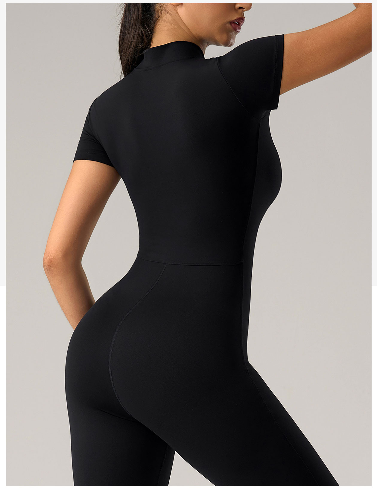 Women's Short Sleeve Zip Front Bodysuit, Slim Fit Seamless Jumpsuit for Workout, Yoga, Gym and Casual Wear
